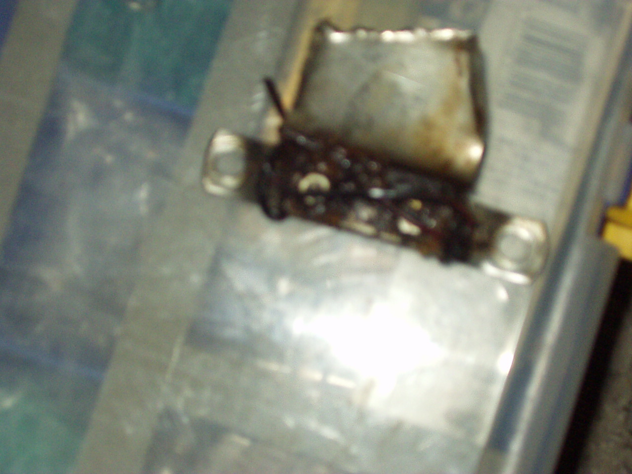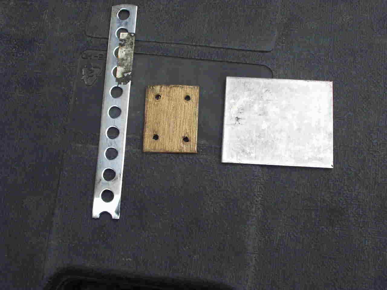 6.4.の場所に小さな市販のステーに薄いステンなどの板を取り付けた金具を取り付けます。写真では見ずらいですが、(ステー,ベニア板、薄いステンの板を小さなネジで固定したもの)これもステーとステンの板を絶縁するためにベニアを使用します。 ステーはマイナス極でステン板はプラス極になってますから 写真は組み立ててないので、ステン板に穴はあけてません。 ここでのステンは出来るだけ薄い板を使用しましょう。 |