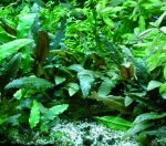 クリプトコリネ・ウエンティ・グリーン Cryptocoryne wendthi スリランカ付近に分布する、もっともポピュラーなクリプトコリネの一つである。栽培もクリプトコリネの中では容易である。多くの変種が存在するが、識別は困難である。底床肥料が有効であるがCO2の添加は特に必要がない。 |