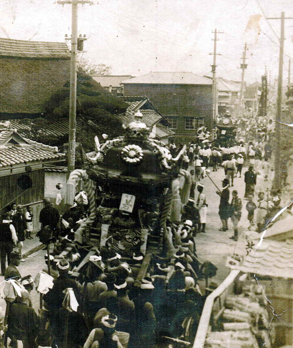 写真右奥より、幟→獅子壇尻→子供屋台→大屋台です。